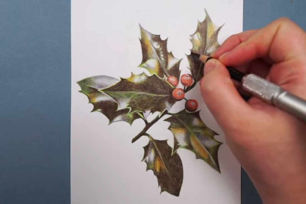 How to Draw Holly Leaves: Colour Pencil Drawing